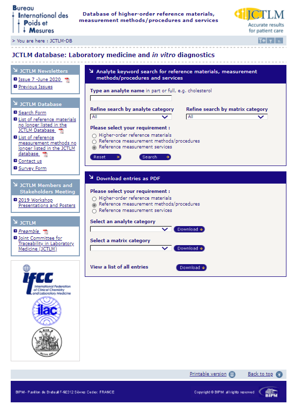 图2 JCTLM 数据库查询网站(www.bipm.org/jctlm/)